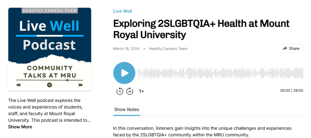 Exploring 2SLGBTQIA + Health at Mount Royal University. Live Well Podcast. March 16 2024.