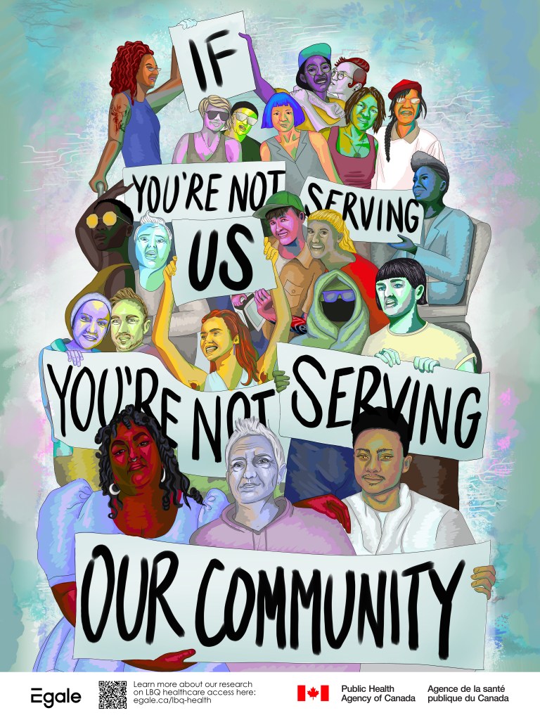 We worked with social artist Melanie Schambach to produce three posters inspired by participants’ perspectives and experience of healthcare (including the image above). These can be downloaded for free for display in healthcare setting, community centers, and other relevant locations. This work was funded by the Public Health Agency of Canada.